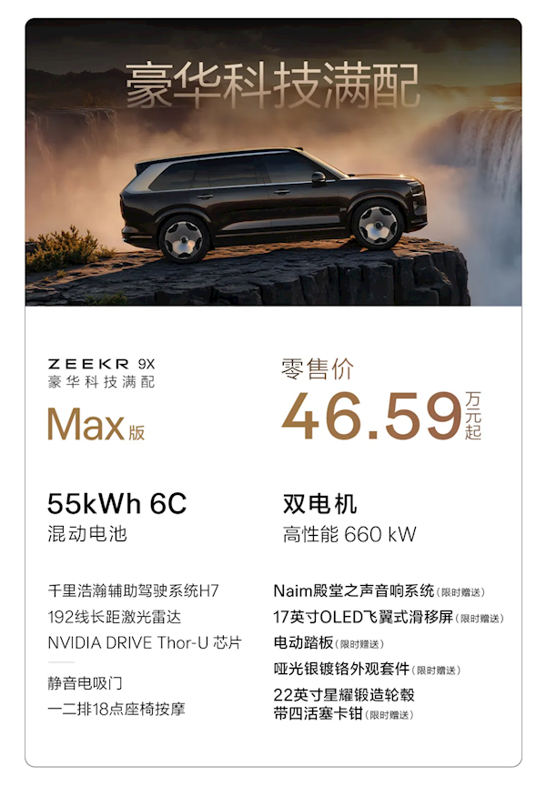 快科技9月29日消息,今日晚间,极氪9X正式上市,共推出四款车型,售价区间为46.59-59.99万元,限时权益售价为45.59-58.99万元。
