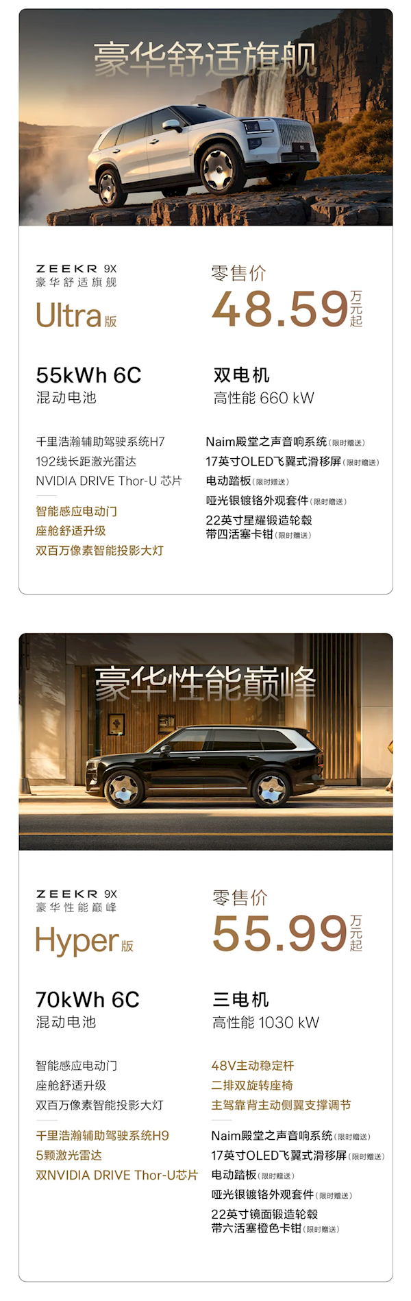 配备55kWh的6C超充混动电池,双电机最大功率660kW,搭载192线长距激光雷达,和Nvida Drive Thor-U芯片,采用千里浩瀚辅助驾驶系统H7,配备静音电吸门、一二排18点座椅按摩。
