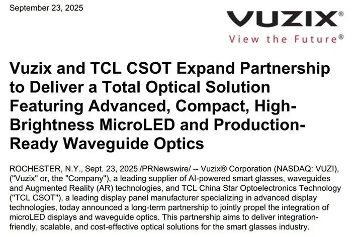 2025年9月23日,智能眼镜与AR技术领域的先锋企业Vuzix宣布与全球显示面板巨头TCL华星光电达成深度战略合作,这一消息迅速引发行业关注。两家企业将整合各自在Micro LED微显示与光波导技术领域的优势,共同打造模块化光学显示解决方案,目标直指降低AR眼镜开发门槛、加速市场化进程。这一合作不仅关乎两家企业的未来布局,更可能重塑整个AR行业的生态格局。