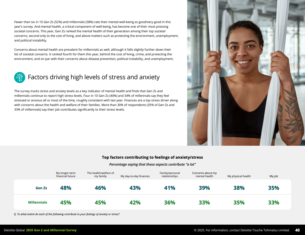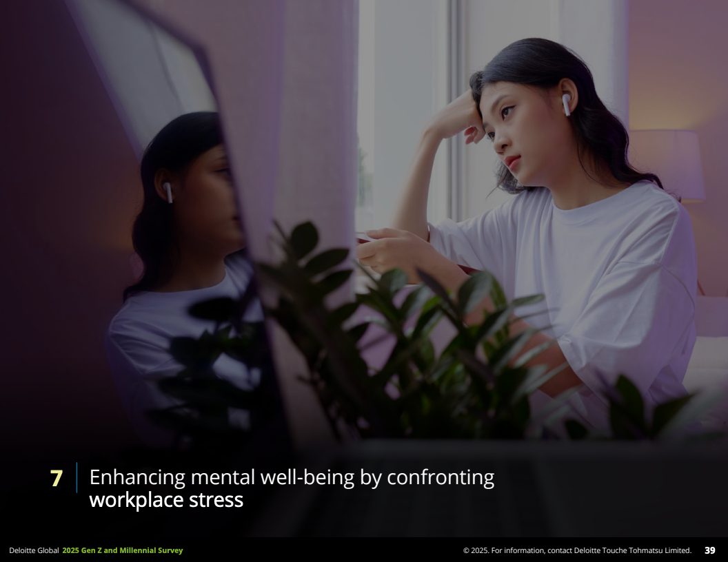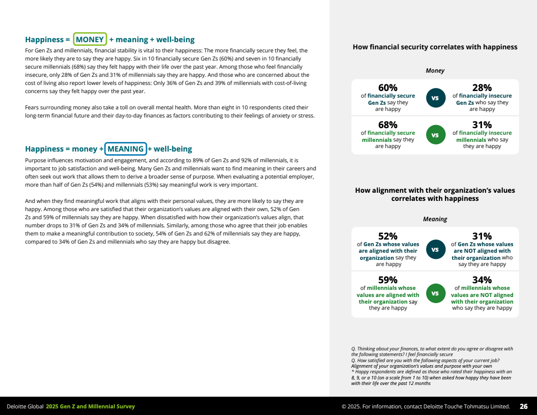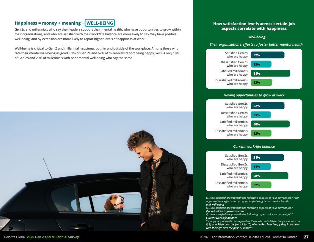 核心层面,幸福感体系由“钱、意义与福祉”三要素构成。金钱安全感与幸福感正相关:60%的财务安全Z世代感到幸福,财务不安全的仅28%;千禧一代对应数据分别是68%与31%。意义感同样关键,超过半数认为有意义的工作对幸福和满意度至关重要。福祉方面,只有52%的Z世代和58%的千禧一代自认为心理健康良好,但约40%表示经常处于高度压力状态,且工作压力主要源自长工时、缺乏认可和职场文化问题。