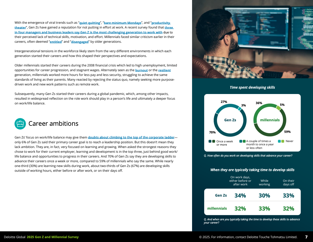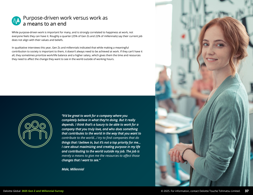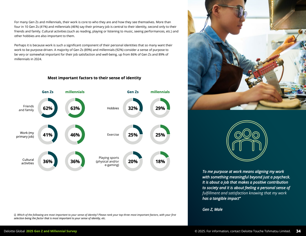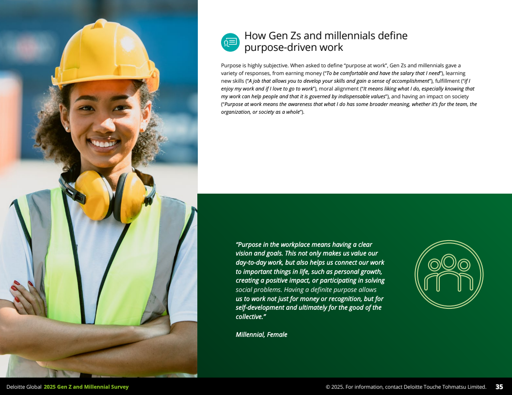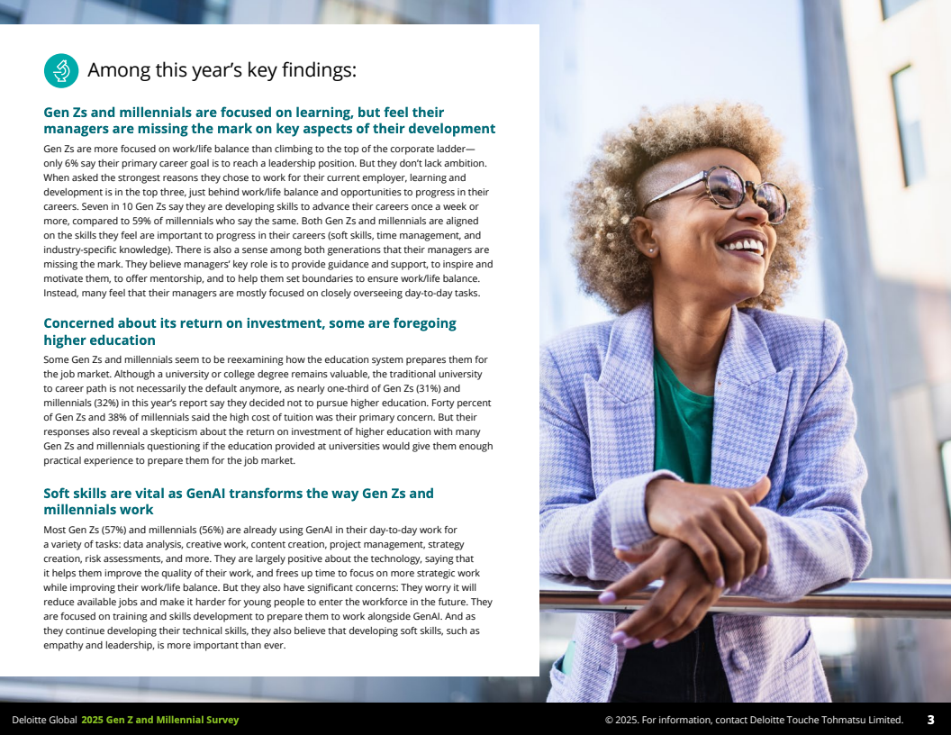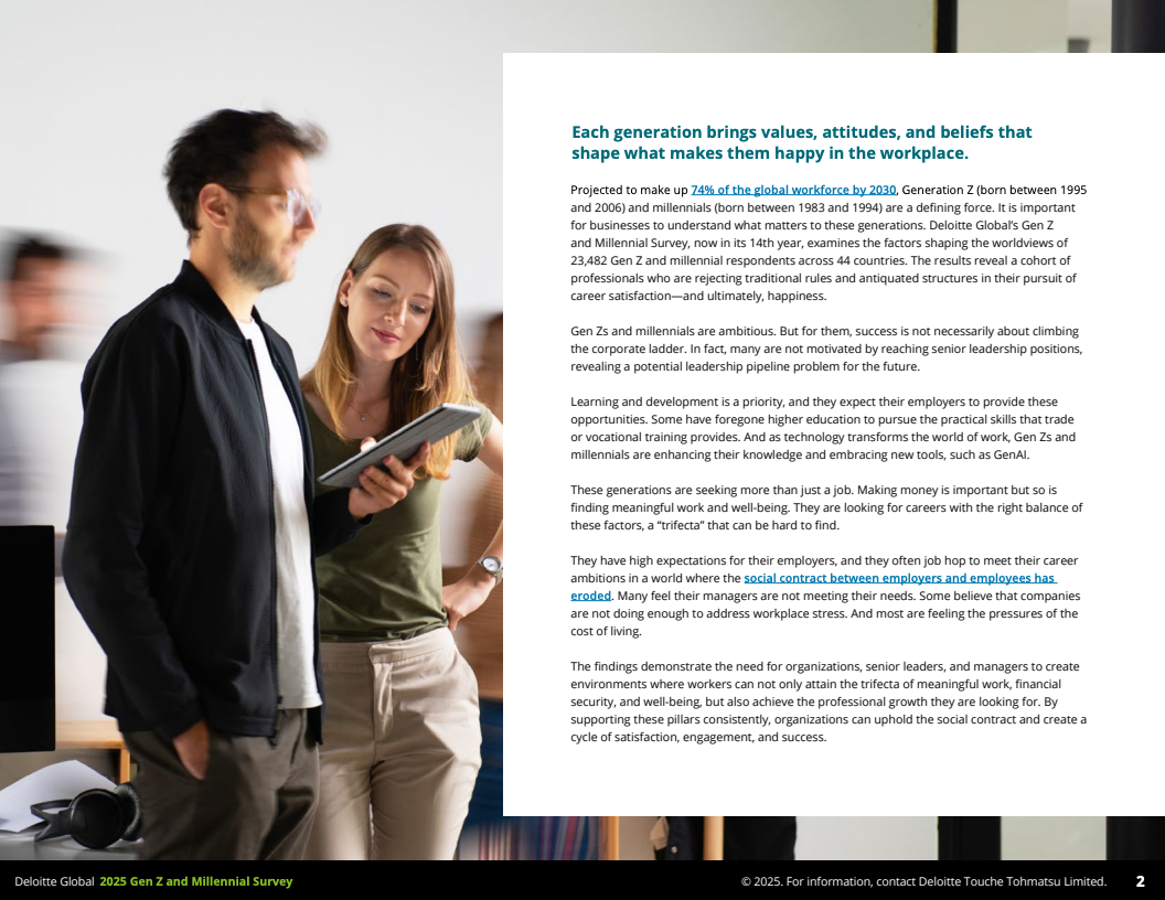 2025年,德勤发布的全球Z世代(1995-2006年出生)与千禧一代(1983-1994年出生)职场调查,覆盖44个国家,收集了23482名受访者数据,勾勒出了这一未来主力军的工作价值观和行为特征。调查显示,到2030年,这两代人预计将占全球劳动力的74%,其职业选择与职场态度正逐步改变传统职场结构与规则。