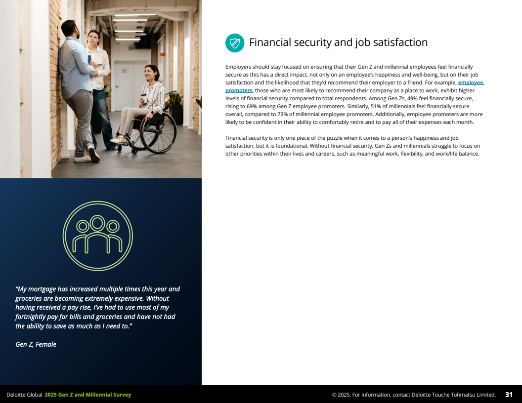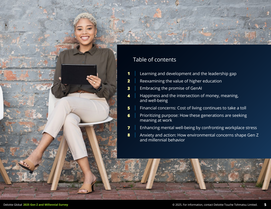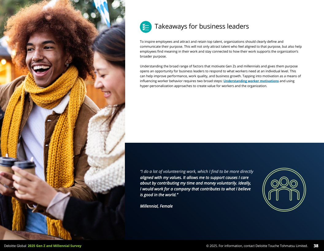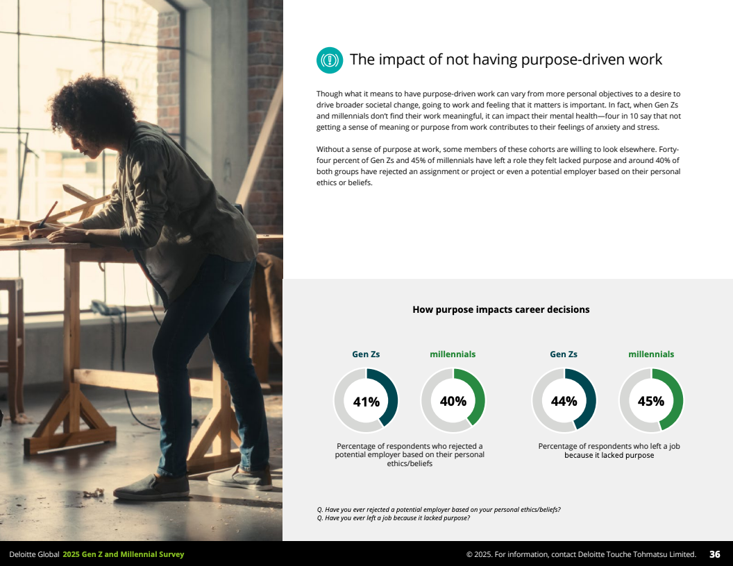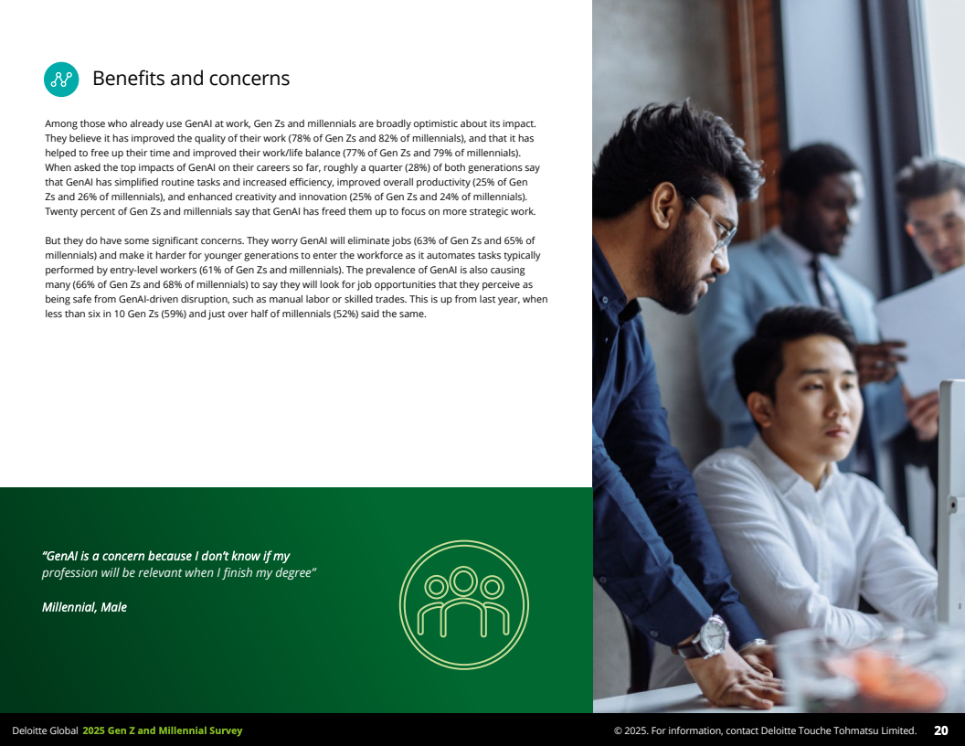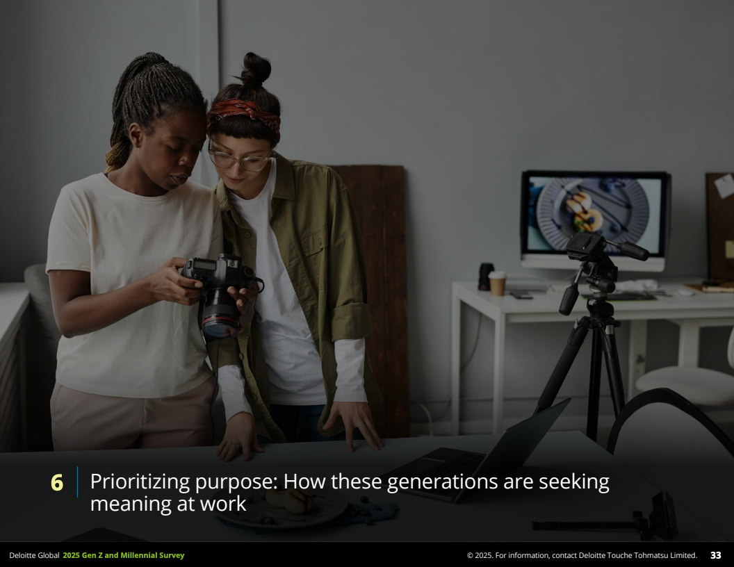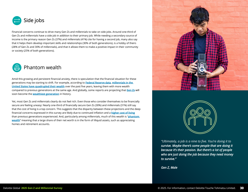 2025年,德勤发布的全球Z世代(1995-2006年出生)与千禧一代(1983-1994年出生)职场调查,覆盖44个国家,收集了23482名受访者数据,勾勒出了这一未来主力军的工作价值观和行为特征。调查显示,到2030年,这两代人预计将占全球劳动力的74%,其职业选择与职场态度正逐步改变传统职场结构与规则。