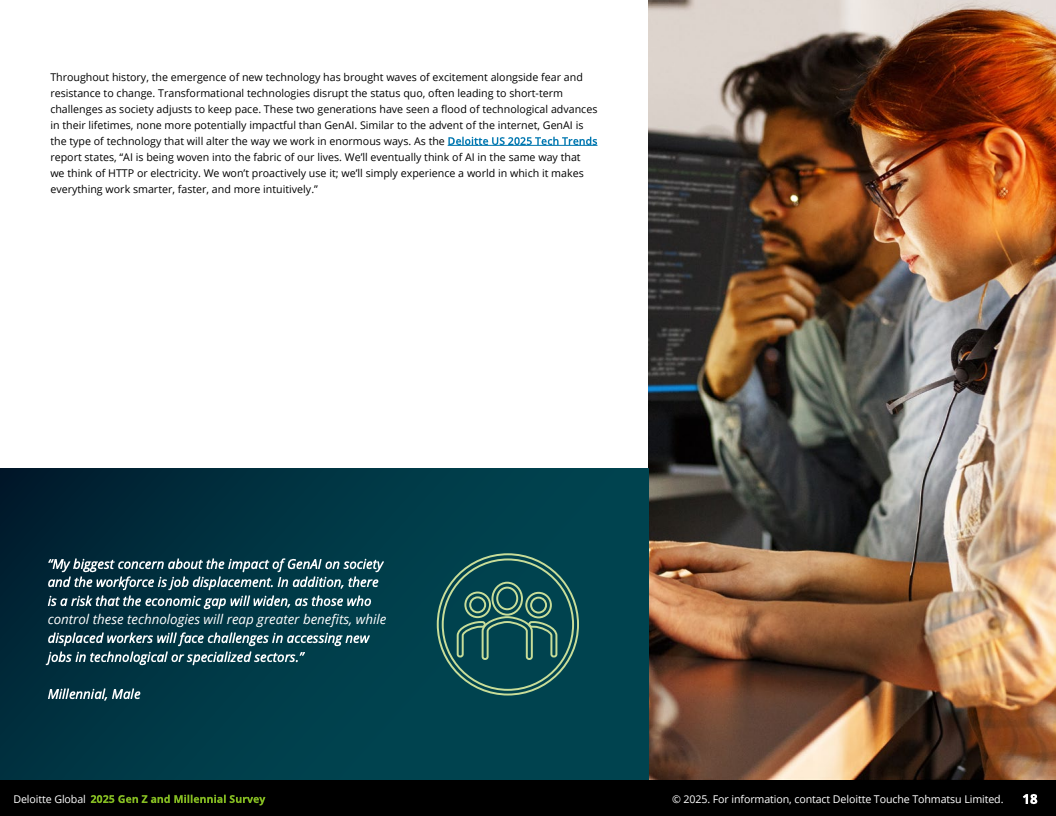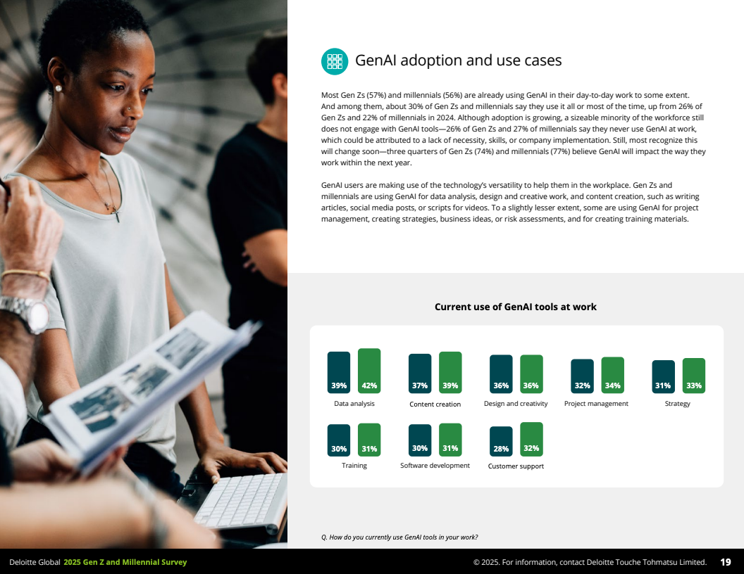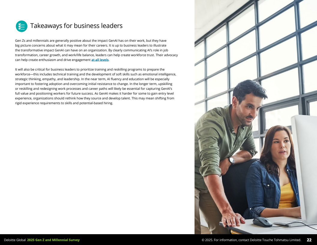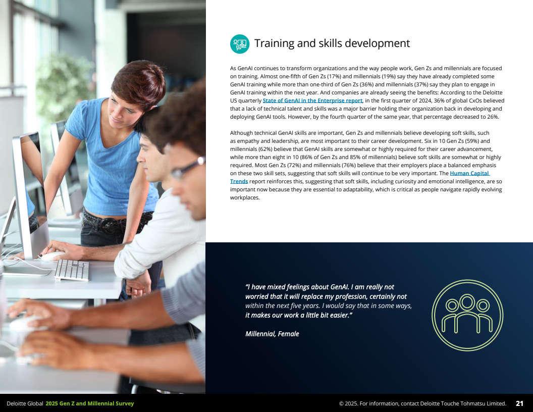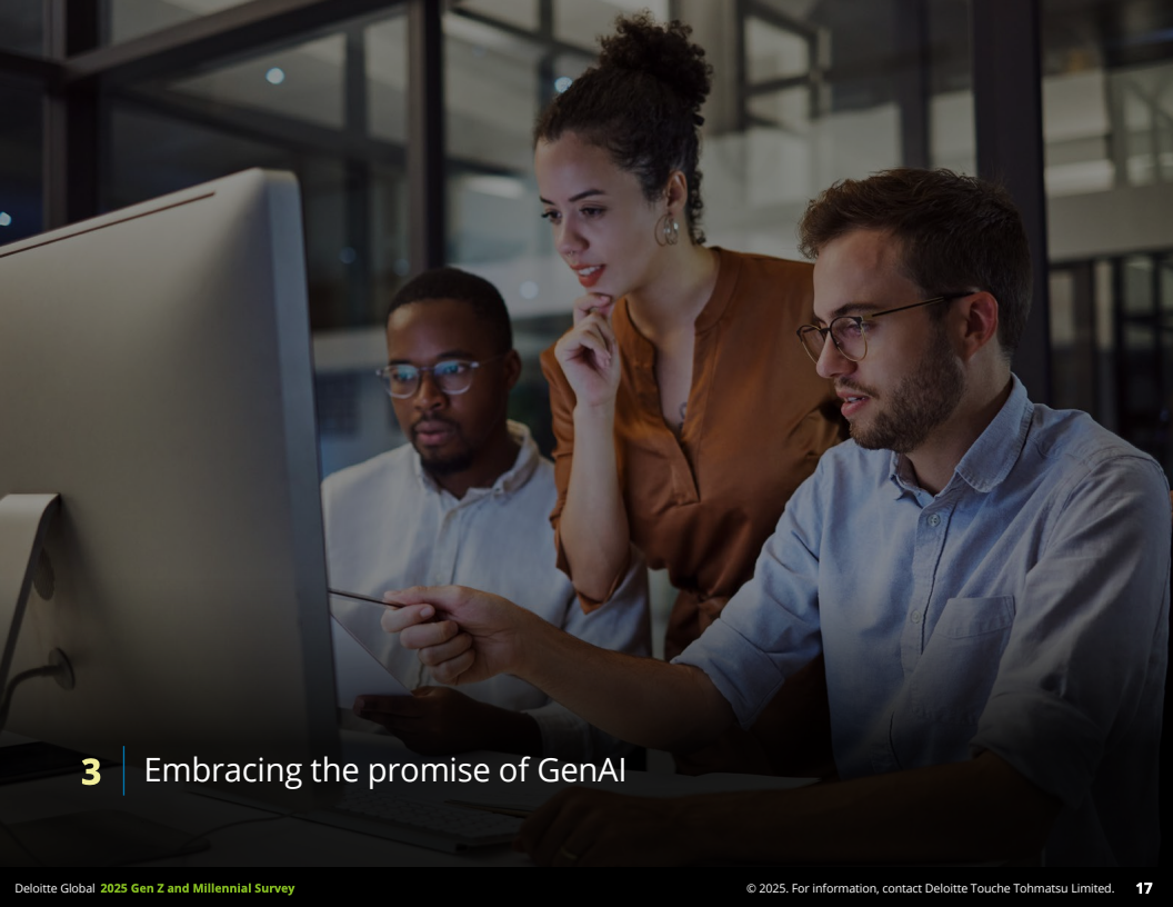 第三,生成型人工智能(GenAI)已广泛渗透职场。超过56%的Z世代和千禧一代日常工作中使用GenAI工具从事数据分析、内容创作和项目管理,提升了工作质量和效率,改善了工作与生活平衡。但同时,六成以上担忧人工智能将导致就业岗位减少,阻碍年轻人进入职场。为此,33-37%的年轻人计划参加GenAI相关培训,企业应加大软硬技能培训投资,以适应技术变革。