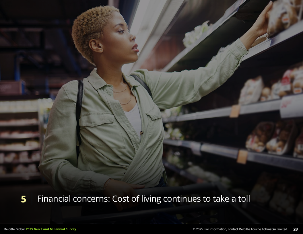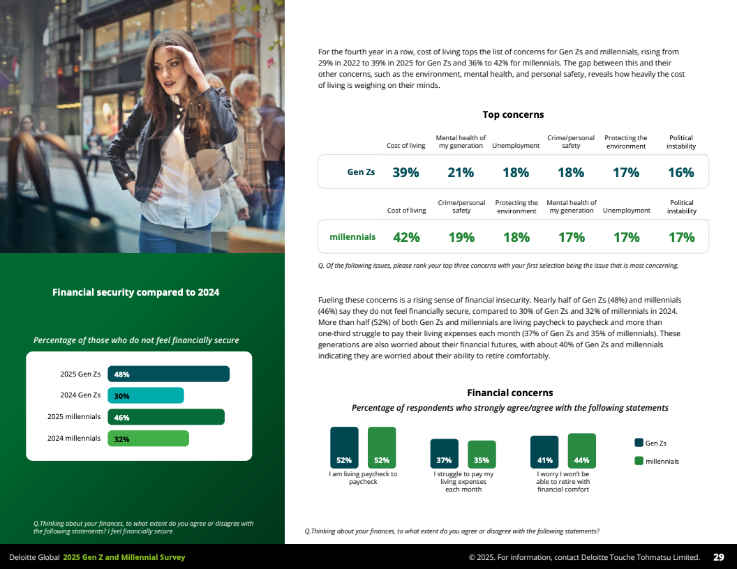 经济压力依旧严峻。近半受访者表示缺乏经济保障,超过五成月光族。生活成本持续上升成为头号忧虑,近40%的受访者感到财务不安,金融压力显著影响其心理健康与职场表现。为了缓解压力,约三分之一年轻人选择兼职以补充收入和提升技能。