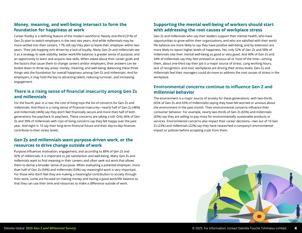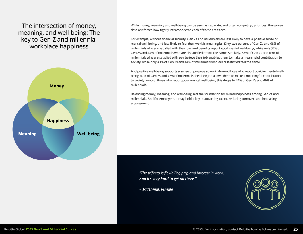 趋势洞察:随着技术迅猛发展和全球经济环境的复杂多变,Z世代和千禧一代对工作的定义正经历深刻转型。他们更强调个性化成长机会、心理健康与社会价值的融合体验。企业若能顺应这一趋势,建设以“钱、意义与福祉”为核心的职场生态,将在人才争夺战中占据先机,促进组织的长期创新和可持续发展。