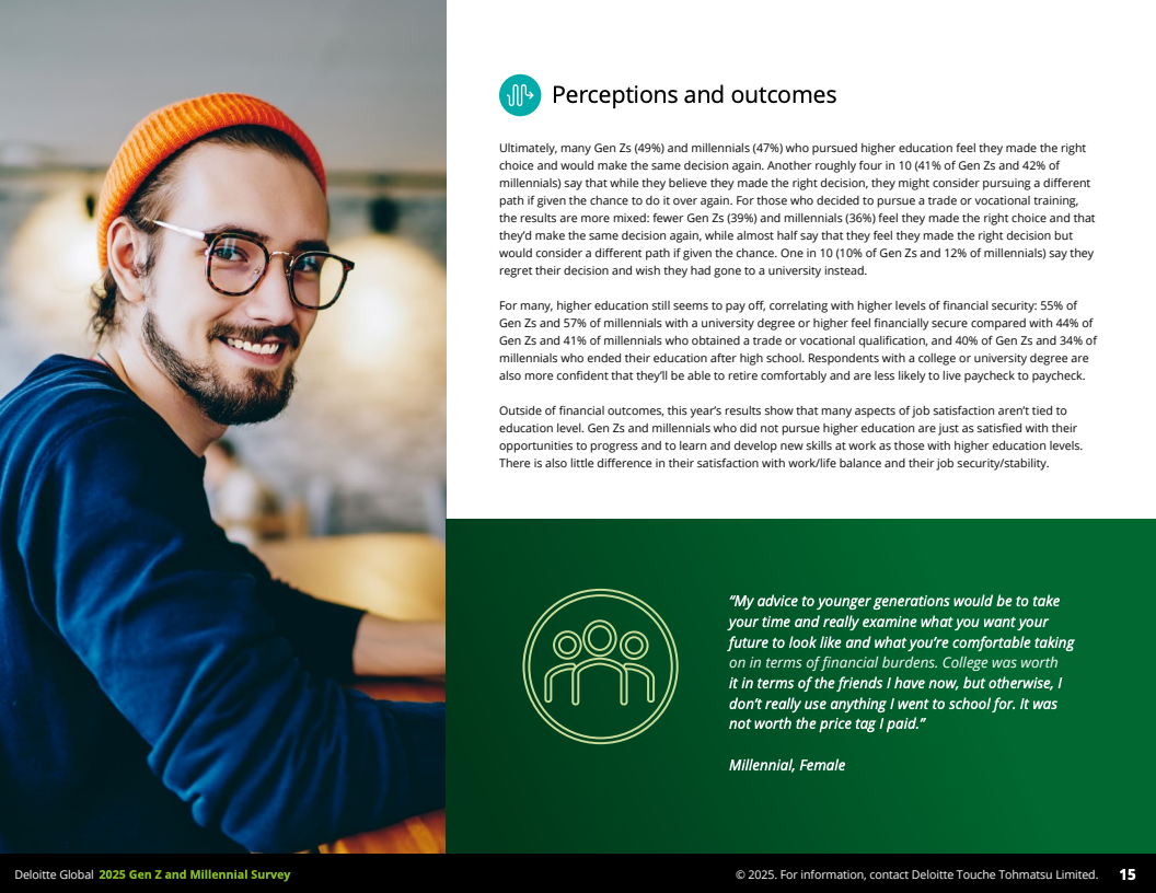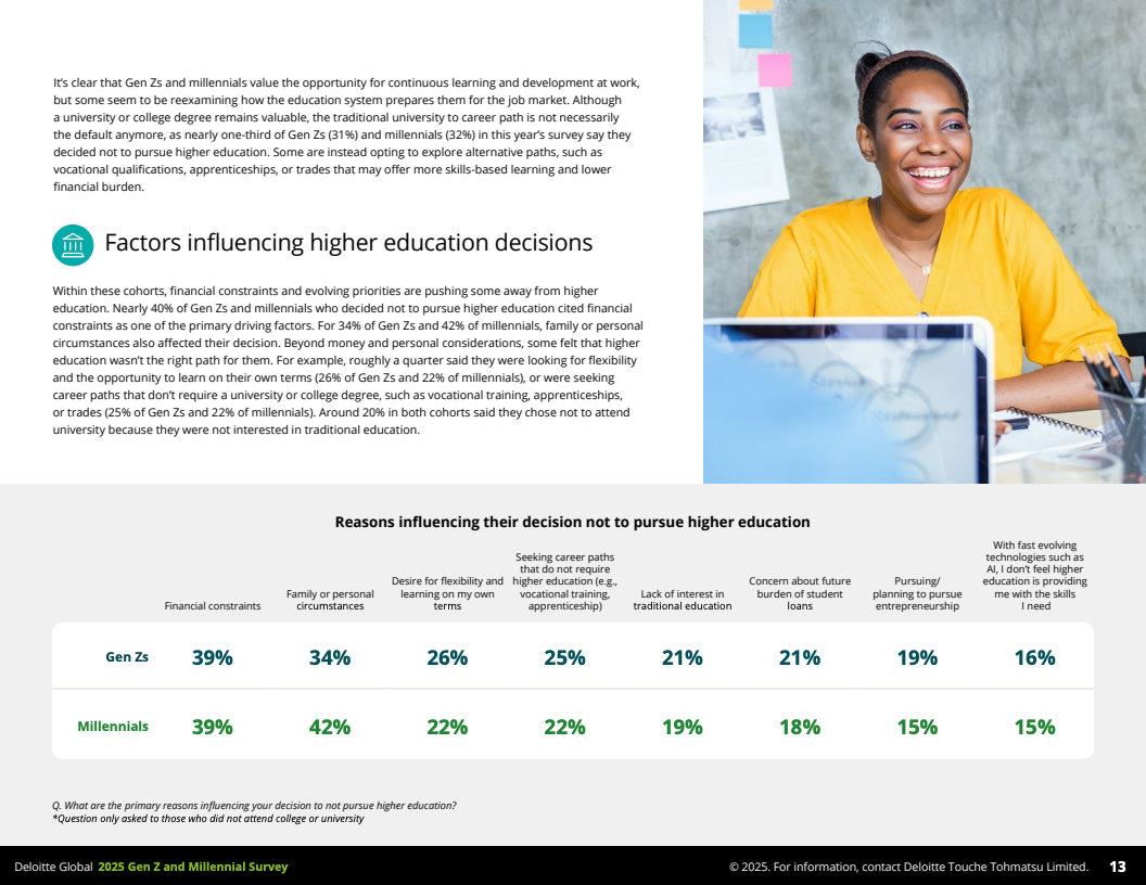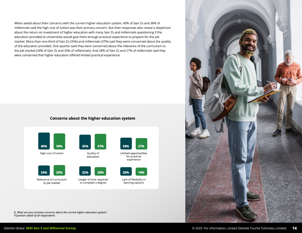 次之,教育路径不再单一。调查中约三分之一受访者选择不攻读高等教育,原因主要包括高昂学费和对传统大学实用性的质疑。40%担忧学费负担,近三分之一担心学校教育与实际工作脱节。与此同时,职业技能培训及学徒制等替代教育方式吸引了年轻群体,这对企业招聘和人才发展提出了新的挑战。