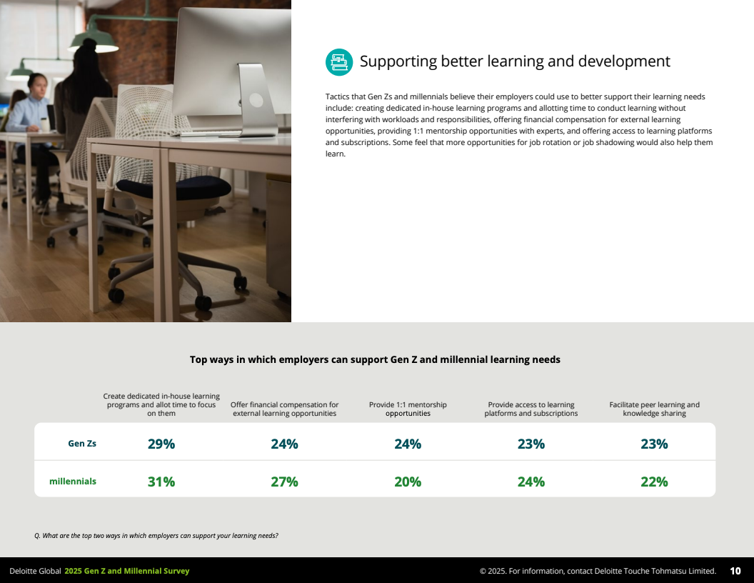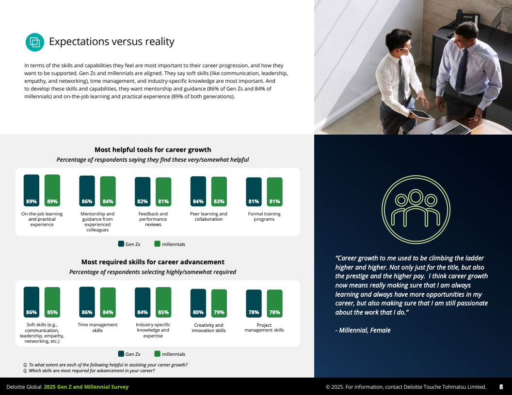 第一,学习与发展成为Z世代和千禧一代的核心需求。70%的Z世代表示每周至少一次积极提升职业技能,优于千禧一代的59%。两代人一致认为软技能(如沟通、领导、同理心)、时间管理及行业专业知识是晋升关键。令人关注的是,尽管他们期望领导提供成长指导与职业激励,但超过半数感到经理人实际上更偏重监督日常任务,管理者与员工之间的期待差距显著。