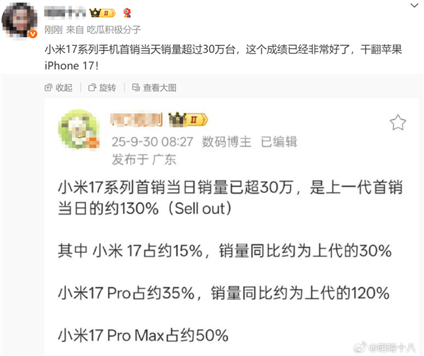 快科技9月30日消息,现在有博主给出了第三方统计数据,显示小米17系列手机首销当天销量超30万台。