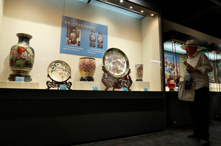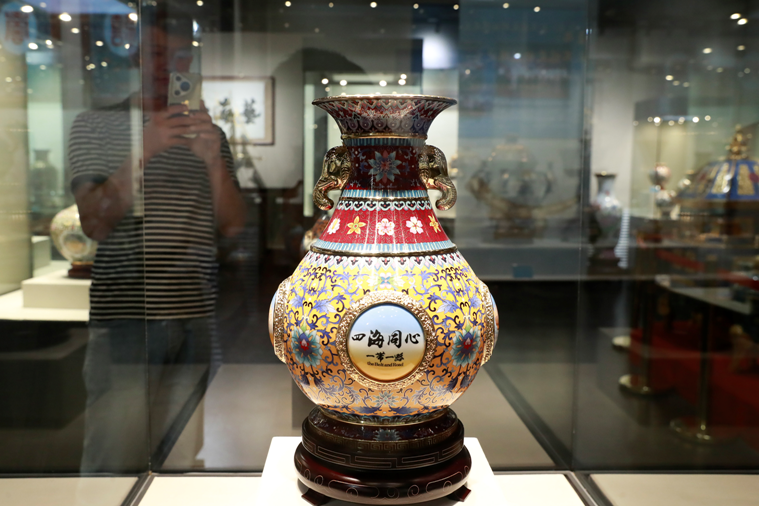 由米振雄创作的代表作品《国色天香》赏盘国礼复刻版和景泰蓝石榴嘴瓶系列限定款也在现场展出发行。该展览持续至11月8日。(王欣 摄影报道)