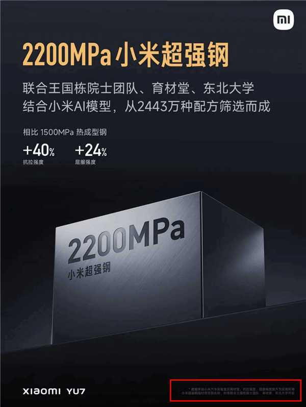 此外,小米汽车还介绍,2200MPa 小米超强钢是目前行业量产最高强度的热成型钢。“2200MPa 小米超强钢”是小米汽车与王国栋院士团队、育材堂、东北大学联合开发的,结合了小米AI模型,从2443万种配方筛选而成,在性能方面非常优异:
