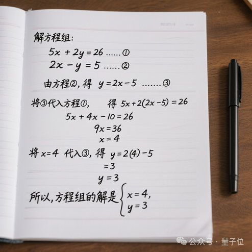 因此,让它生成一张解方程的步骤图,prompt“解方程组5x+2y=26,2x-y=5,给出详细过程”,它也能把题目解出来并完成生成:
