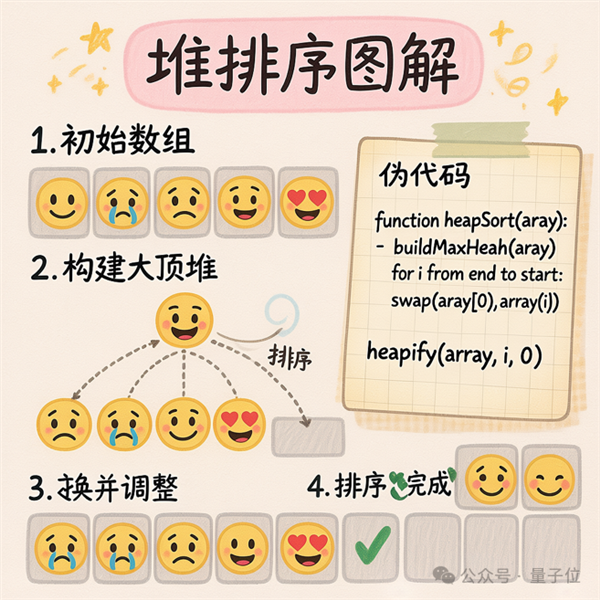 “用一幅图介绍堆排序算法流程,用小黄脸的表情包,来可视化,表情越开心,代表数值越大,并提供伪代码,手帐风格,小红书图片样式”,就连这种特别复杂的prompt它都能驾驭: