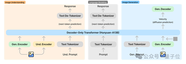 不同于将LLM仅作编码器的传统DiT路线,混元3.0的原生多模态设计以LLM为核心底座,天然继承强大的语言与推理能力,并在预训练阶段即深度混合LLM数据、多模态理解与多模态生成数据,形成“理解反哺生成、语言驱动视觉”的正反馈闭环,显著提升语义对齐、细节控制与复杂场景的创作稳定性。