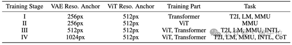 训练始于一个渐进式的四阶段预训练,该过程从较低的256像素图像分辨率和基础的图文对与纯文本数据开始,逐步将VAE处理的分辨率提升至512像素乃至1024像素,并在高分辨率阶段引入了如图像编辑、多图融合等更复杂的交错图文数据(INTL)以及用于激发推理能力的思维链数据(CoT)。