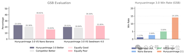 在人工评测GSB(Good/Same/Bad)中,HunyuanImag 3.0相较于Seedream 4.0胜率为1.17%,相较于Nano Banana胜率为2.64%,相较于GPT-Image胜率为5.00%,相较于目前最好的上一版本模型HunyuanImage 2.1胜率为14.10%,这表明HunyuanImage 3.0是足以媲美业界领先闭源模型的开源模型。