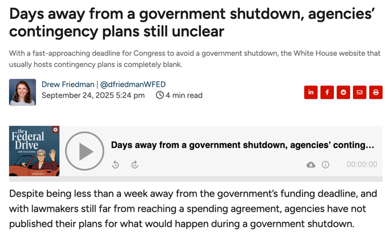 △专门聚焦报道联邦政府管理与政策的美国媒体Federal News Network报道,尽管政府面临“停摆”,但两党在主要问题上的分歧远未达成一致。