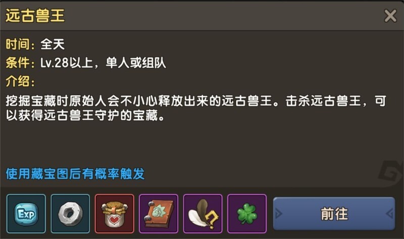 挑战远古兽王可让驯兽师获取丰厚经验奖励,同时有机会获得忠诚罐头,用于提升宠物忠诚度。还可掉落随机羽毛、舞王秘诀等跳舞玩法专用道具,以及三叶幸运草,使用后能增加装备合成时的幸运值。值得一提的是,远古兽王支持组队挑战,合作通关更轻松。