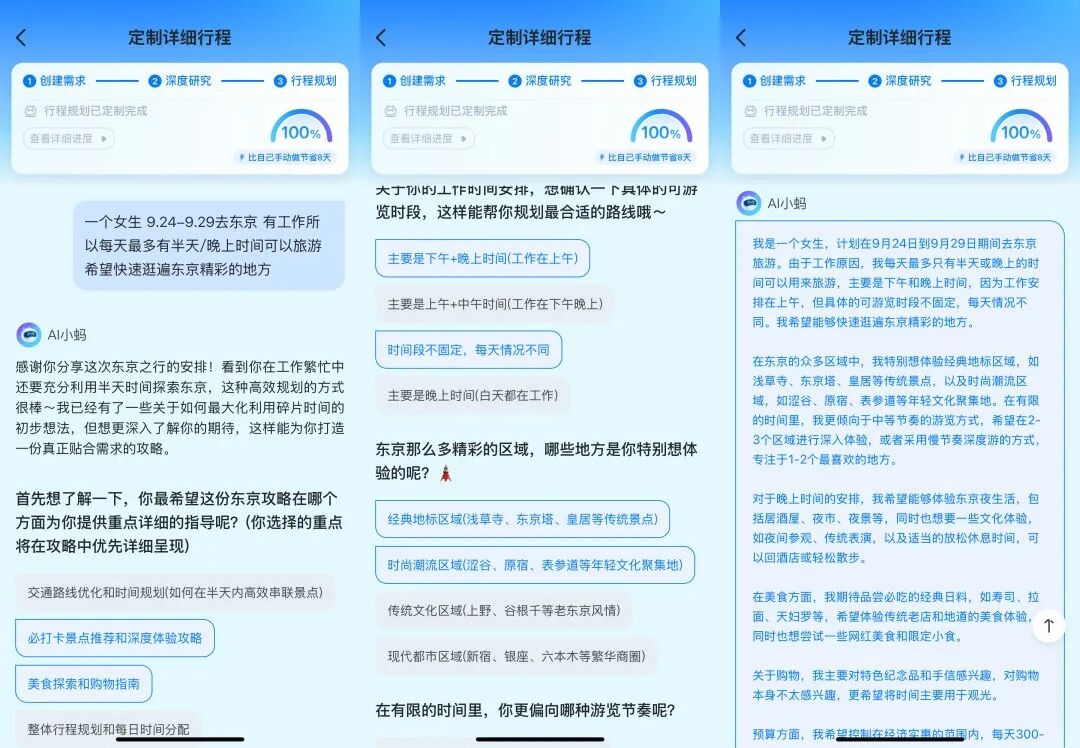AI 旅行助手在这里有一个小巧思,把大模型的简答题变成了选择题,直接点选,点选本身比较轻松,因此笔者也用更短的时间顺利地给出了更多的信息。