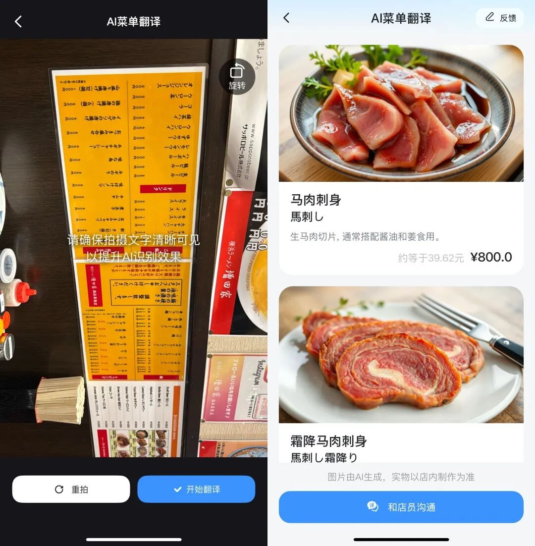 在点餐环节,AI 旅行助手提供了一个 AI 翻译菜单的功能,拍照日文菜单,能够直接生成一个全新的带有图片的新 UI 界面。