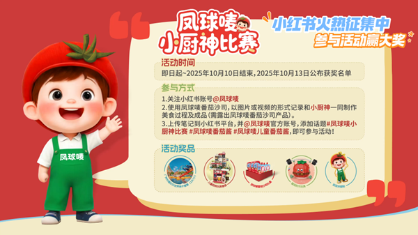线上端,“凤球唛小厨神比赛”征集活动同步火热开展,鼓励亲子家庭积极参与。大家只需提交使用凤球唛儿童沙司制作的创意菜式照片或视频,并附带指定话题标签,即可参与评选。官方将从作品贴题度、创意度及品牌关联度等维度综合考量,评选出1名创意小厨神金奖、3名萌趣小厨神奖及30名小厨神能量翻番奖,获奖名单将于10月13日正式公示,让更多家庭在创意创作中感受健康饮食的魅力。