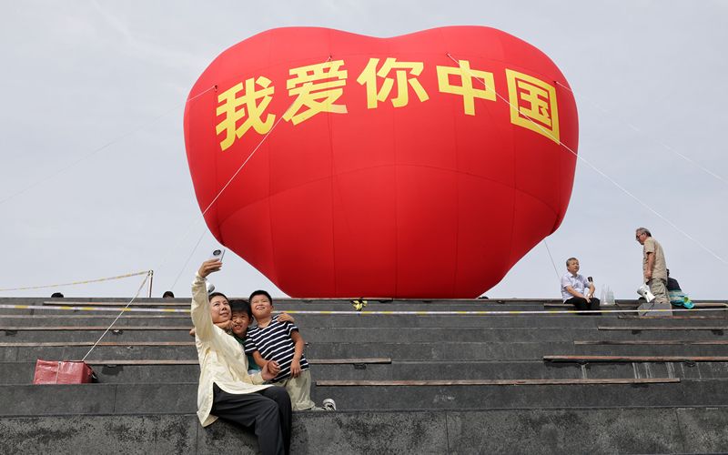 10月1日,南苑森林湿地公园燕景台,游客在巨型心形气膜装置前留影。新京报记者 陶冉 摄