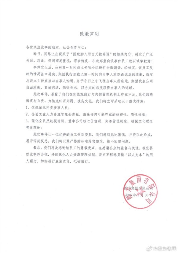 得力集团在致歉声明中表示,公司第一时间成立专项小组进行全面调查。集团执行总裁已第一时间向当事人致以最诚恳的道歉,指定总裁办主任直接与当事人沟通,期望代表公司当面致歉,真诚沟通,倾听诉求,以务实的态度获得当事人的谅解。