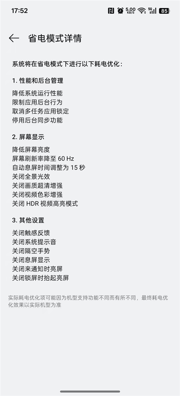 如上图所示,开启省电模式后,系统会从性能和后台管理、屏幕显示、其他设置等方面节省手机电量,虽然降低屏幕刷新率可能会让手机观感更卡,但毕竟出行游玩也不用一直盯着手机看。