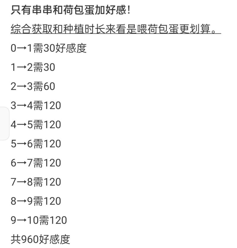 初始好感度为0级,喂食鸡蛋可增加1点,串串增加2点,累积一定点数后升级,最高可达10级,具体升级所需点数见下图。