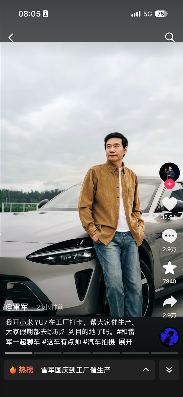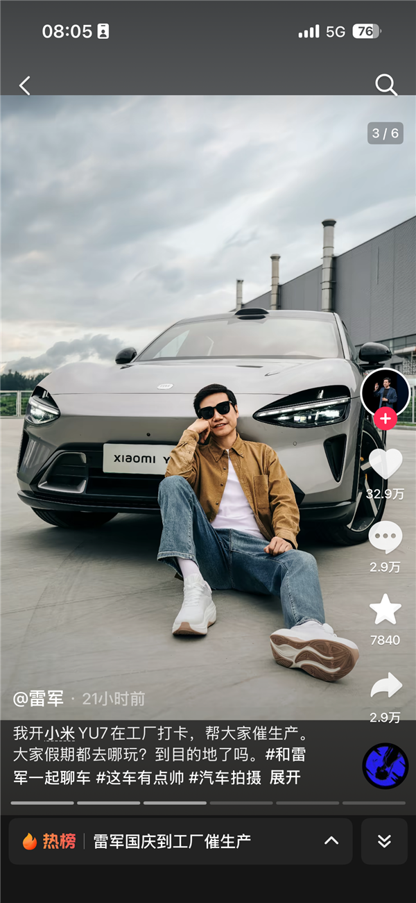 雷军在配文中写道:我开小米YU7在工厂打卡,帮大家催生产。大家假期都去哪玩?到目的地了吗。