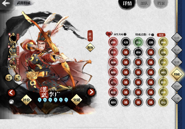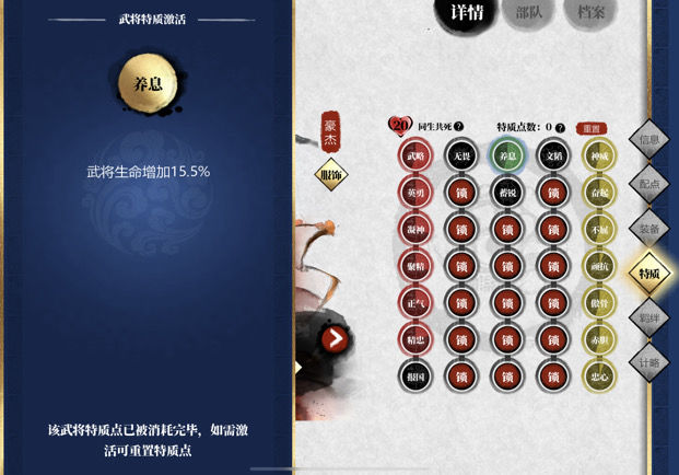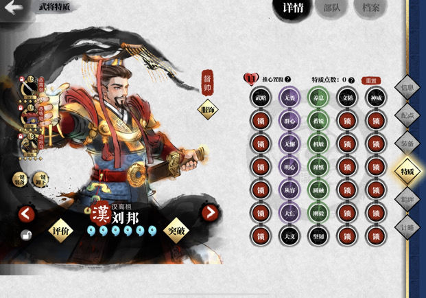 提升亲密度后,进入武将界面添加特质。