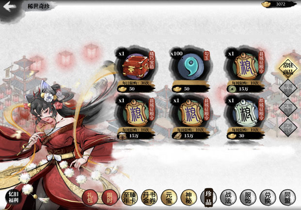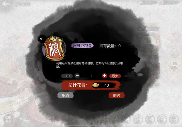 每月限购40元宝可购5粮征粮令。