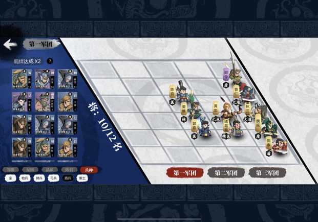 关于卷土的布阵,可参考此前发布的一帖,其中具体武将与兵种搭配已不再适用,但盾、枪、骑、策、弓的整体站位依然具有参考意义。