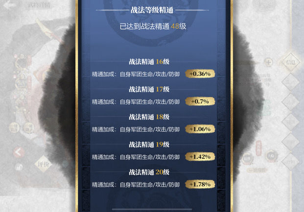 升级战法后可获得对应总等级的精通加成,详情可通过武将界面战法旁的提示图标查询。