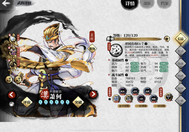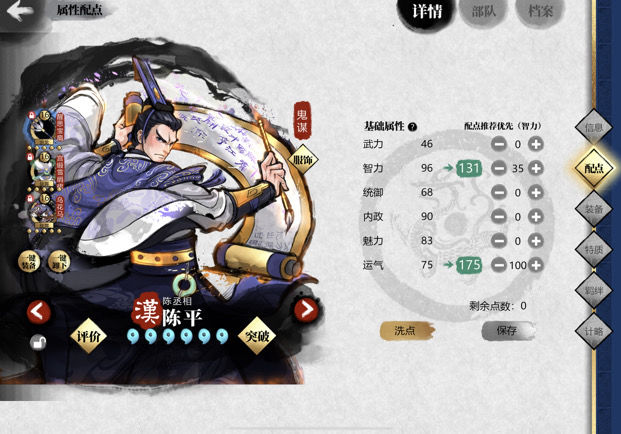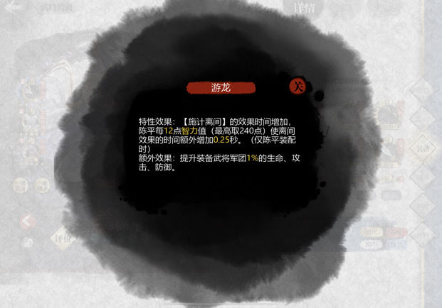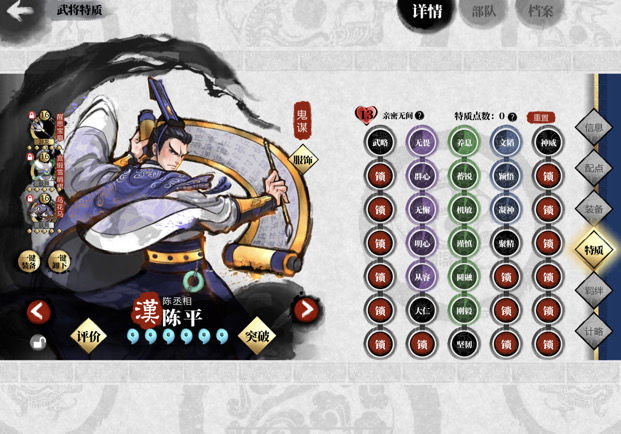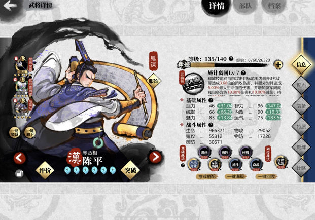陈平的技能与战法均为控制类,缺乏策攻加成,除专属武器提供的240智力外,无其他智力增益。