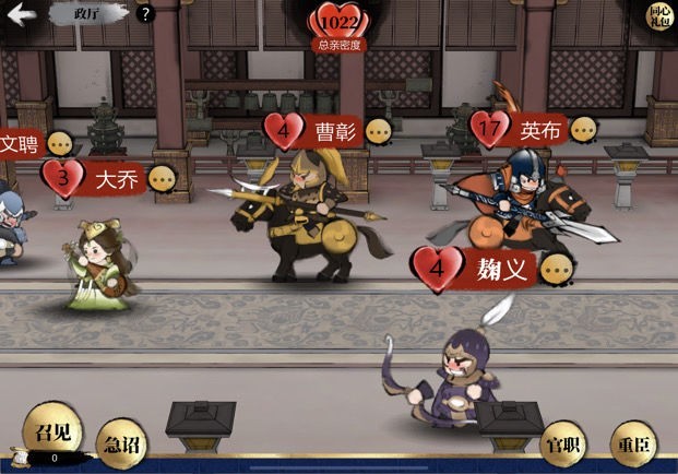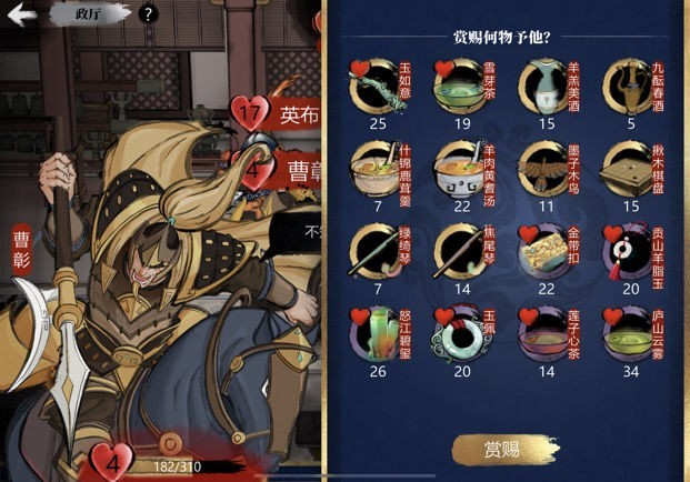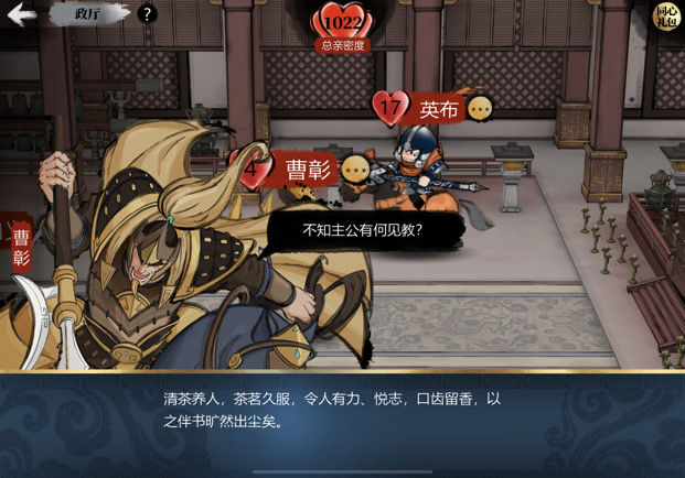 每位武将偏爱两类礼物,闲谈后会出现爱心提示,便于了解其喜好。