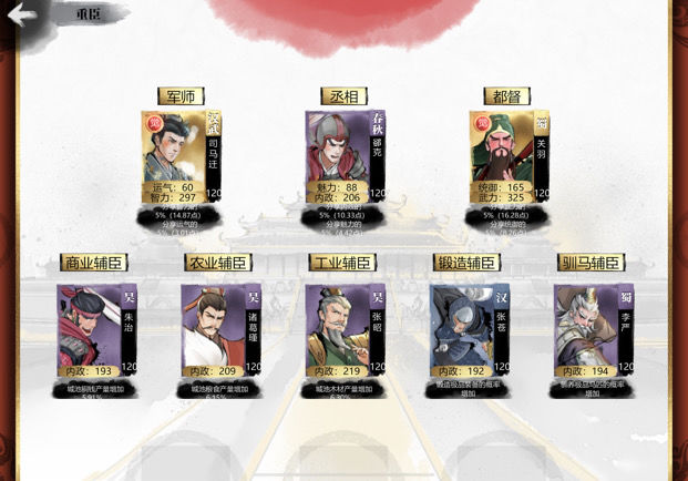 中军师、丞相与都督可为他人提供增益,但自身无法享受这些加成效果。