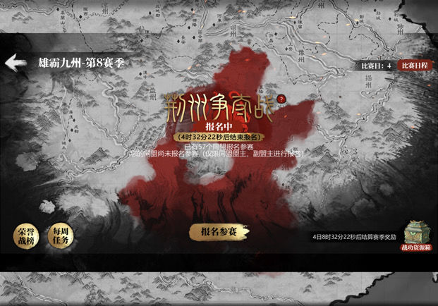 每周一、三、五晚八点,多数同盟可报名参与九州战斗,每两周结算一次,发放资源箱,每个箱子含各类资源各50万。