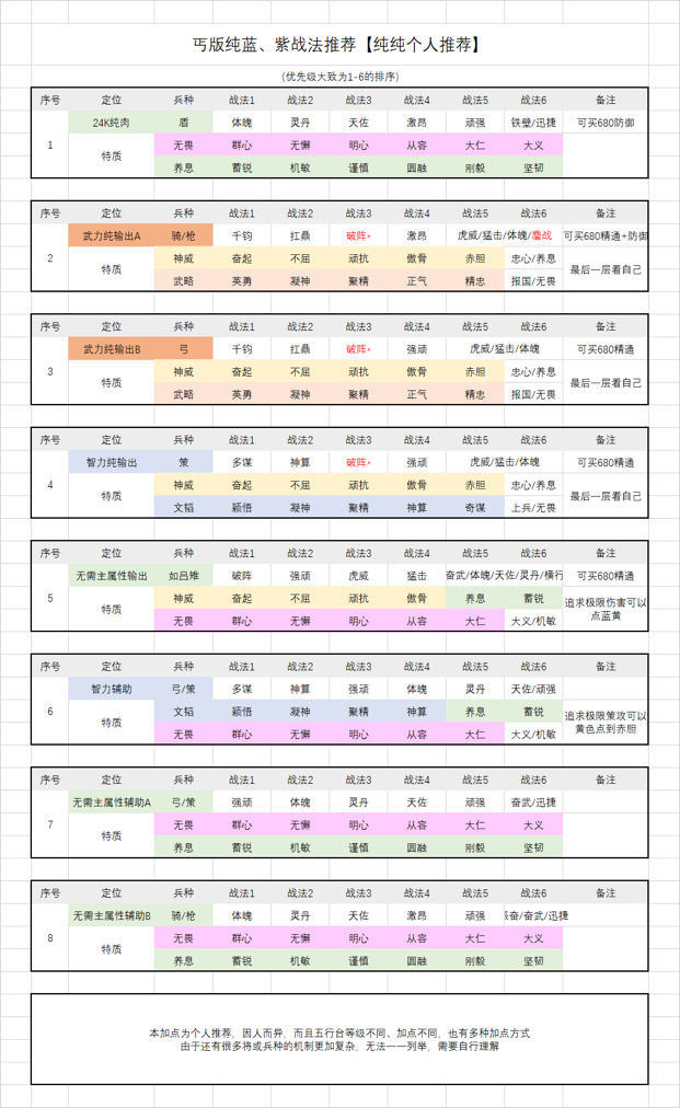 平民玩家应优先选择蓝紫品质的战法作为基础配置。