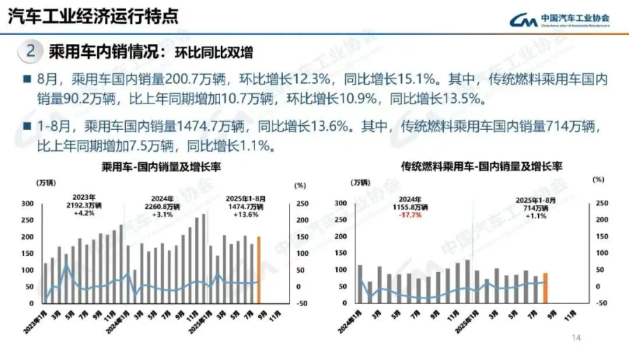 1-8月,乘用车国内销量1474.7万辆,同比增长13.6%。其中,传统燃料乘用车国内销量714万辆,比上年同期增加7.5万辆,占48%。虽然新能源已经超越燃油车的市场份额,但优势仍然是微弱的,燃油车依然同比增长了1.1%。