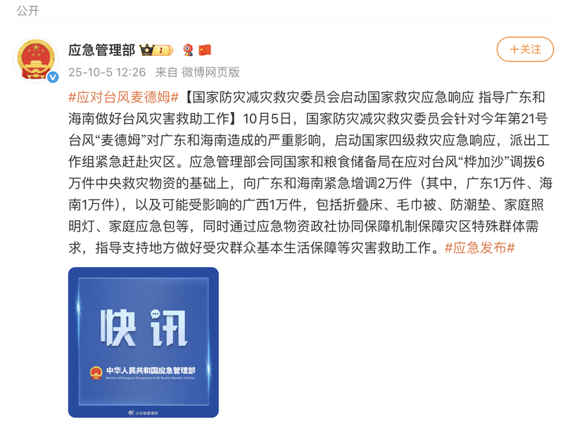 新京报讯 据应急管理部消息,10月5日,国家防灾减灾救灾委员会针对今年第21号台风“麦德姆”对广东和海南造成的严重影响,启动国家四级救灾应急响应,派出工作组紧急赶赴灾区。