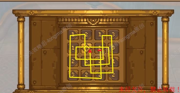 把置于祭坛,随后返回平台,从右上角阴影处出发,依次踩灭所有亮灯的地板,注意不可踏上已熄灭的区域。