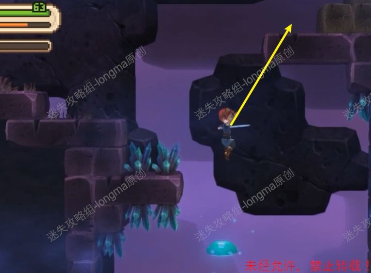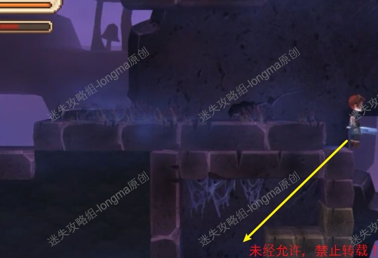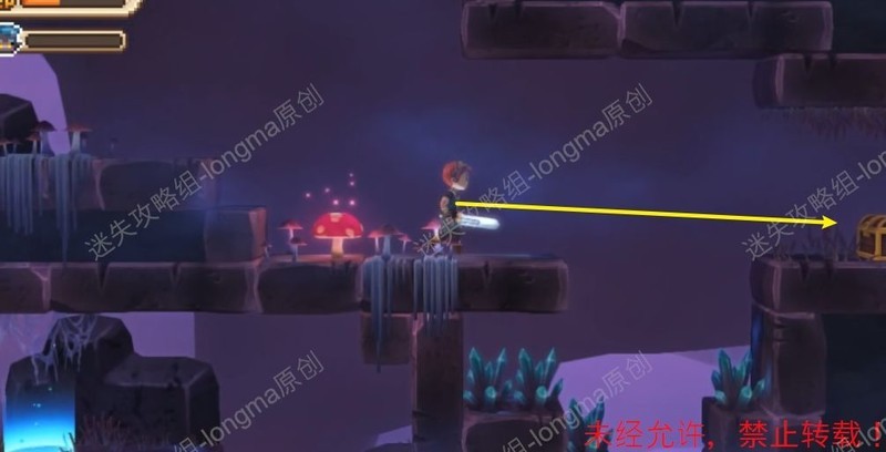 闯关启动后持续向上跳跃,抵达顶部平台,击碎下方石块发现宝箱,取得。
