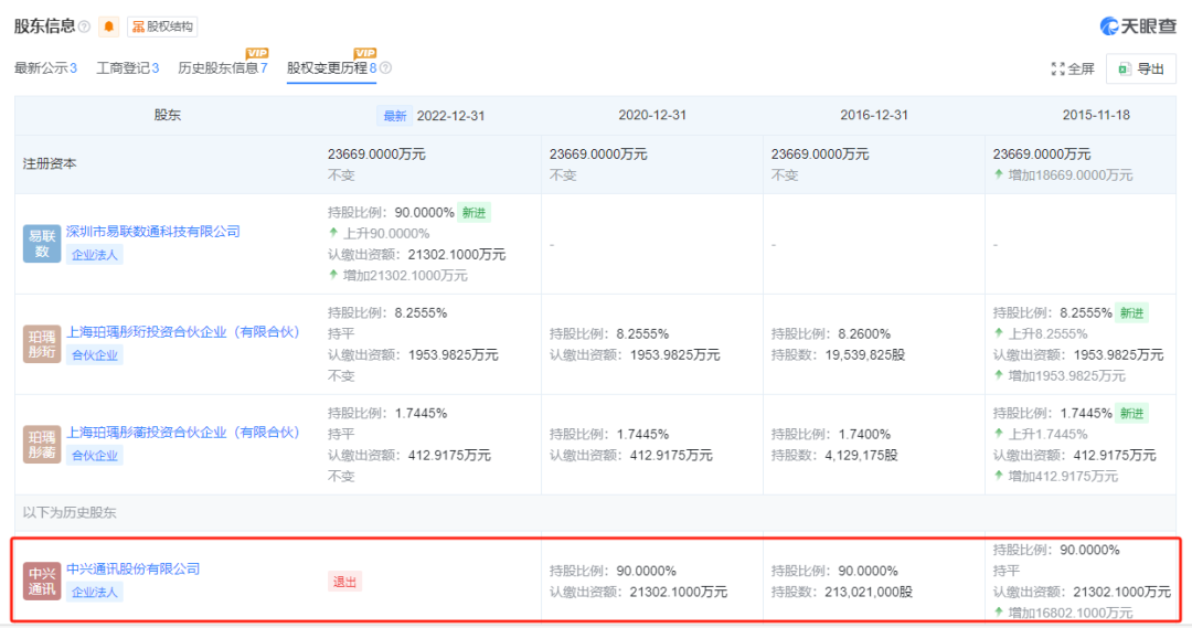 有意思的是,天眼查信息显示,上海易联数通科技曾用名“上海中兴易联通讯股份有限公司”,资料显示,该企业是中兴通讯最早在上海设立的控股子公司,2022年底,公司股权变更,持股比例90%的中兴通讯退出。目前,上海易联数通科技属于国有控股。