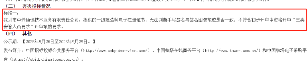 在标段一中,深圳市中兴通讯技术服务有限责任公司提供的一级建造师电子注册证书,无法判断手写签名与签名图像笔迹是否一致,不符合初步评审中资格评审“三类安管人员要求”评审项的要求,最终被否决投标。