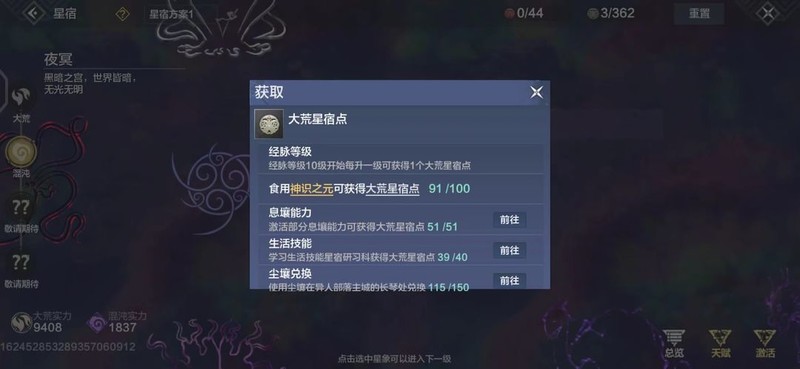 激活息壤之力,可获取大荒星宿点。