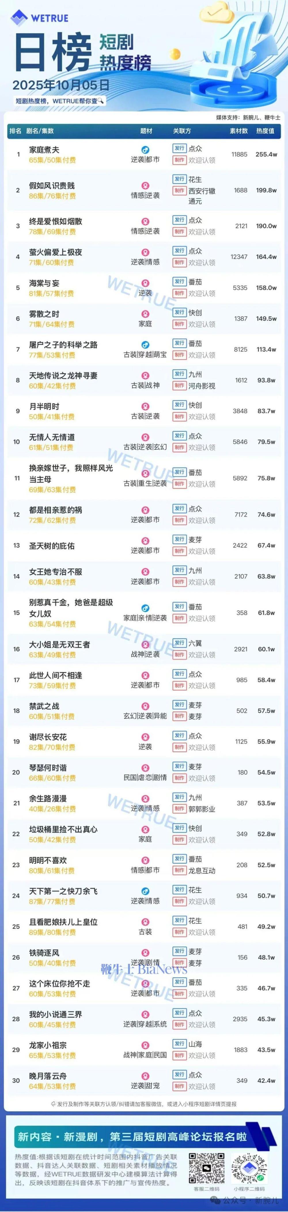 1、本日榜为WETRUE短剧数据公司提供,新腕儿和鞭牛士提供联合支持。