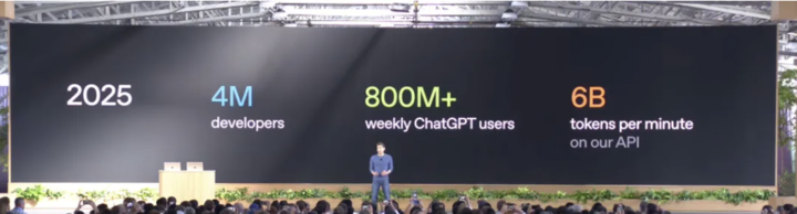 两年后,在 OpenAI 刚刚召开的 Dev Day 上,CEO Sam Altman 在会上透露:如今已有 400 万名开发者在使用 OpenAI 构建产品,超 8 亿人每周用 ChatGPT,API 每分钟处理 60 亿 tokens。