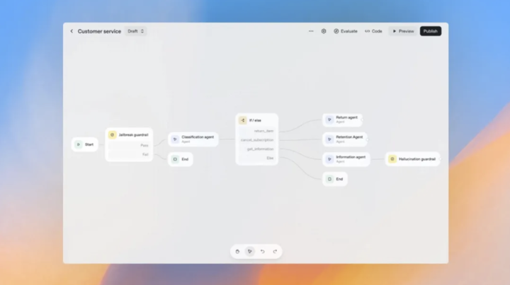具体来说,Agent Builder 提供可视化画布,支持通过拖拽节点来编排逻辑、连接工具,并配置自定义安全规则。支持预览运行、内嵌评估设置以及完整版本控制。