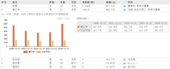 可以看出,管江华在海天味业工作已近三十年了,且曾负责公司营运方面的工作,营运经验十分丰富,薪酬也在公司高管中处于较高水平。管江华2024年薪酬为603.3万元,相较于2023年的379.6万元,上涨了223.7万元,仅次于公司董事长程雪,后者2024年薪酬为913.5万元。