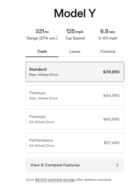其中,Model Y标准版续航里程从357英里下降至321英里,19英寸轮毂改成18英寸轮毂,可花1500美元选装19英寸轮毂。